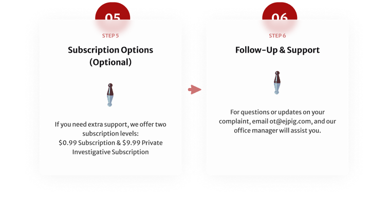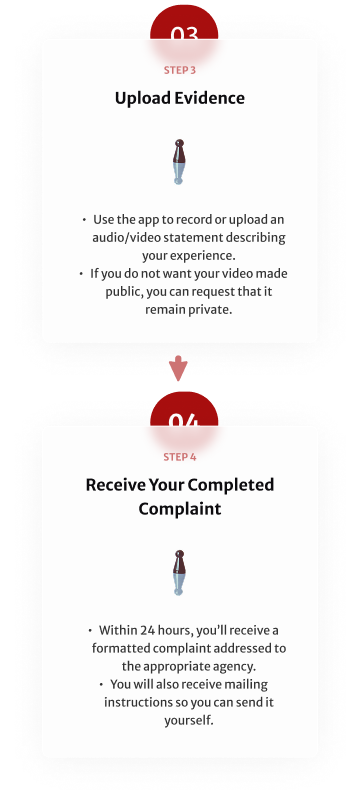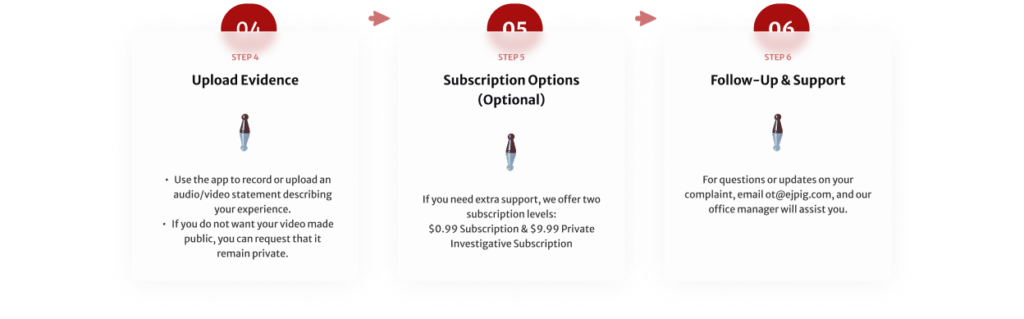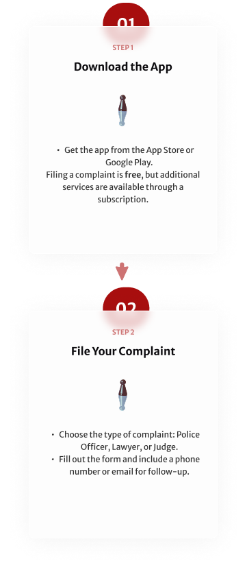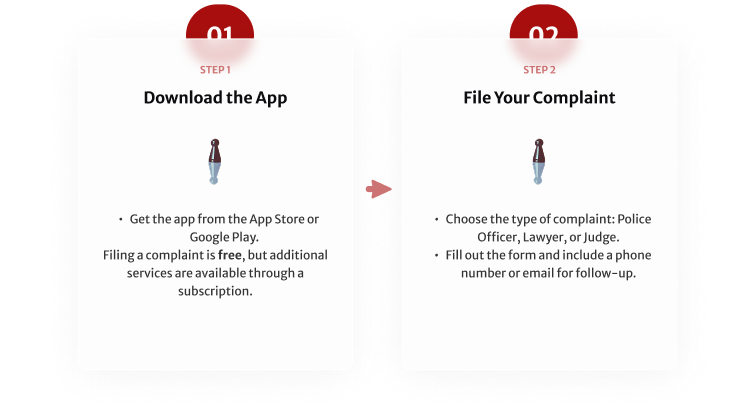 The Courtroom Accountability Project provides tools to help individuals report police misconduct, legal misconduct by judges or lawyers, and domestic violence concerns. Our app makes it easy to file complaints and access investigative support when needed.